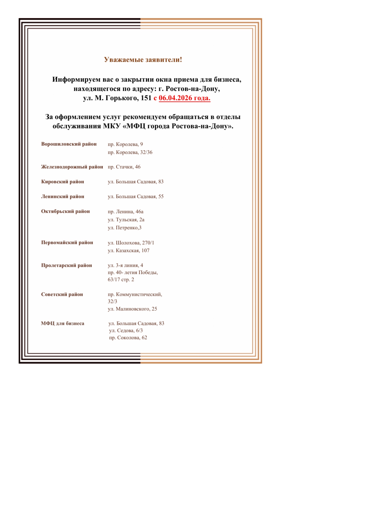 Закрытие окна приема по адресу г. Ростов-на-Дону, ул. М. Горького 151